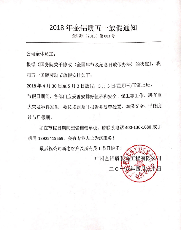 根據(jù)《國務院關于修改〈全國年節(jié)及紀念日放假辦法〉的決定》,我司五一國際勞動節(jié)放假安排如下: