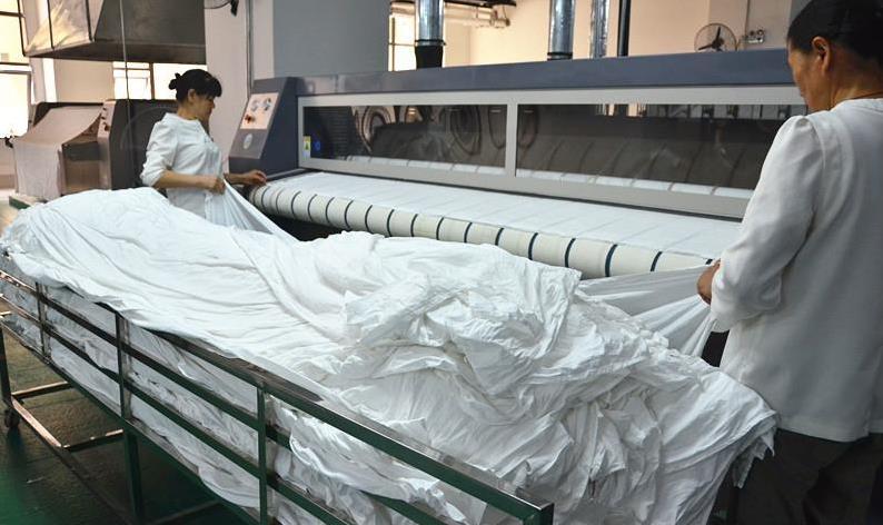 工作人員將洗凈的床單擺放整齊過(guò)機(jī),統(tǒng)一通過(guò)機(jī)器烘熨。